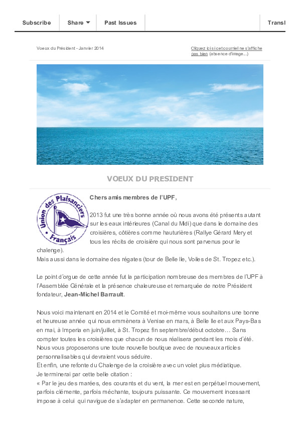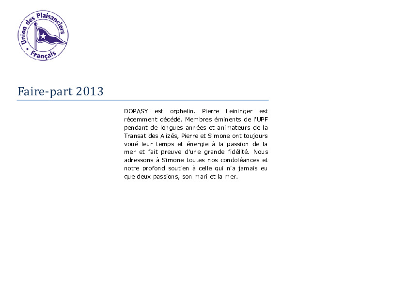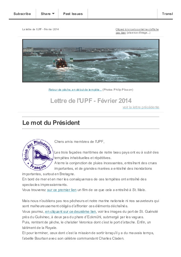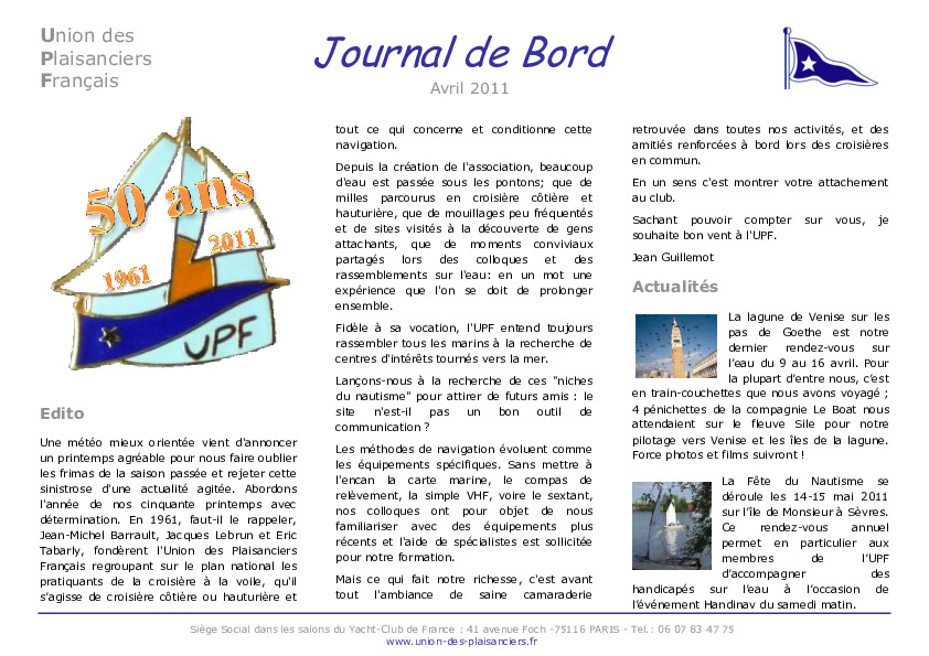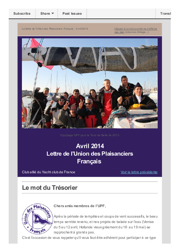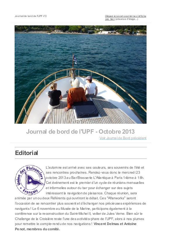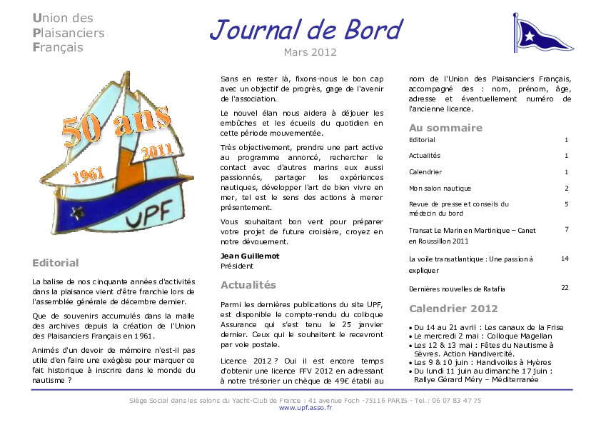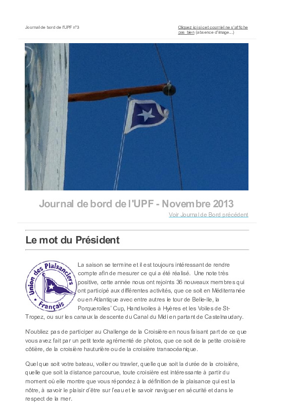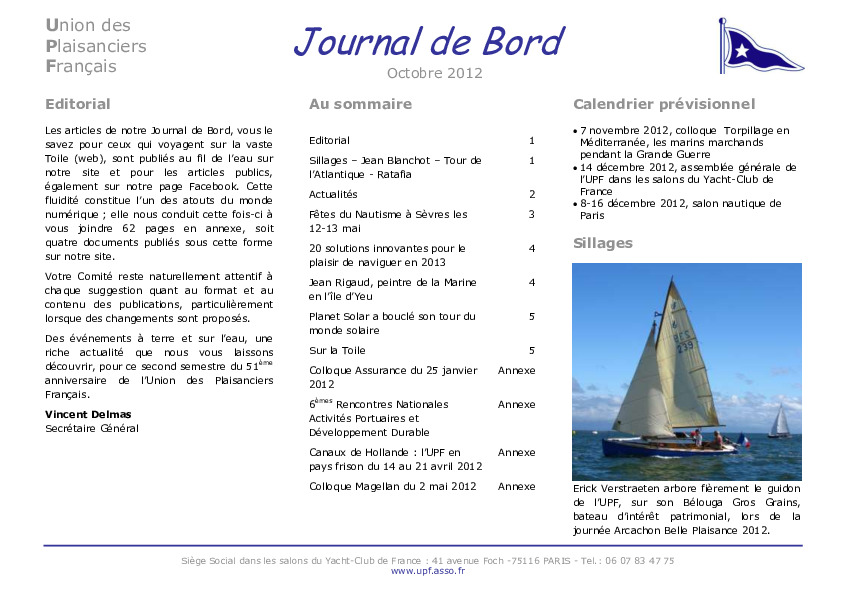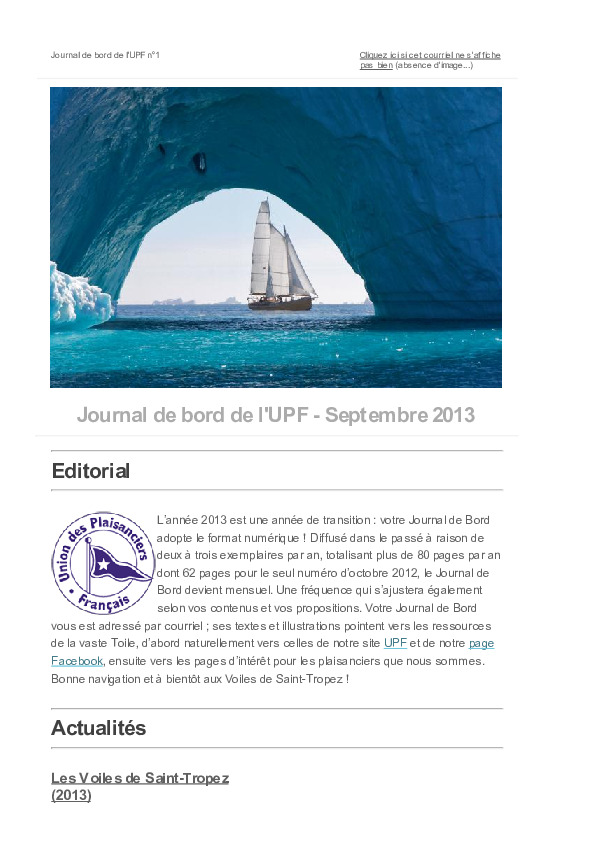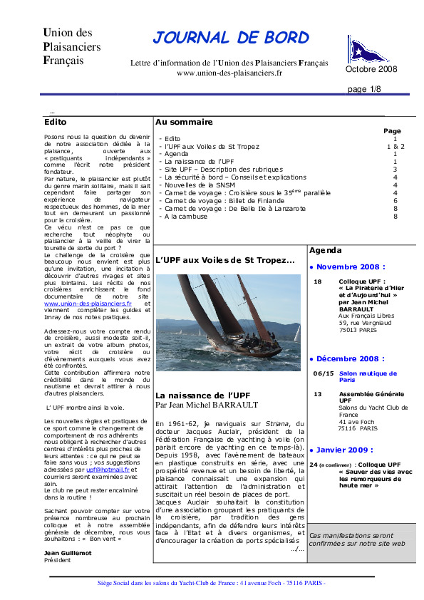 La naissance de l'UPF en 1961 par Jean-Michel Barrault - Les Voiles de Saint-Tropez - Notre nouveau site internet - Croisière sous le 35ème parallèle, par Jean Guillemot - Billet de Finlande, par Vincent Delmas - De Belle Ile à Lanzarote, en solitaire, par Dominique Debout - Langoustes à la Bouzara, recette croate.