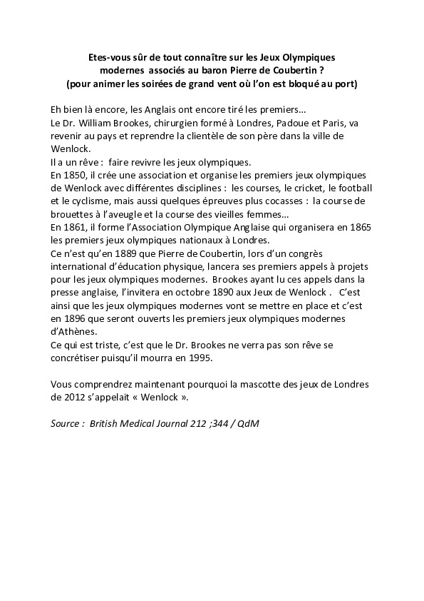 Etes‐vous sûr de tout connaître sur les Jeux Olympiques modernes associés au baron Pierre de Coubertin ? (pour animer les soirées de grand vent où l’on est bloqué au port)