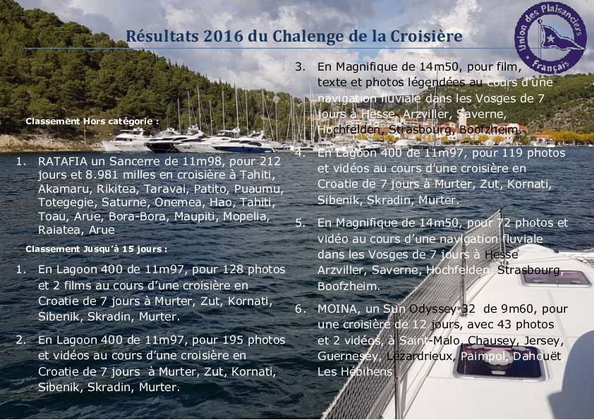 - Calendrier 2010 - Rallye Gérard Méry - De la plaisance et des livres - 3,60 autour du monde - Carnet de voyage : Ratafia - Soyons utiles… Seconde vie pour nos voiles - Présence sur le Net - Obtenir une licence FFV.