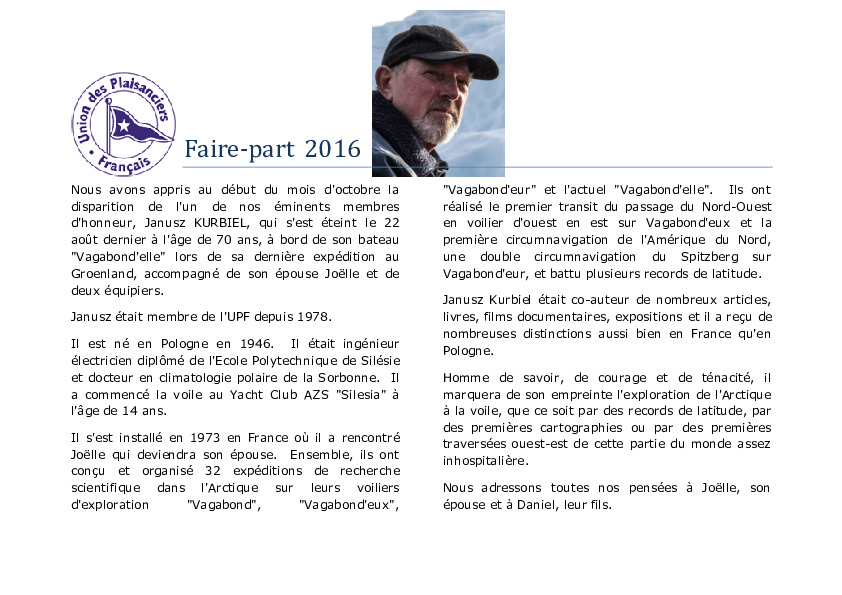 Janusz Kurbiel s'est éteint le 22 août dernier à l'âge de 70 ans, à bord de son bateau "Vagabond'elle" lors de sa dernière expédition au Groenland, accompagné de son épouse Joëlle et de deux équipiers
