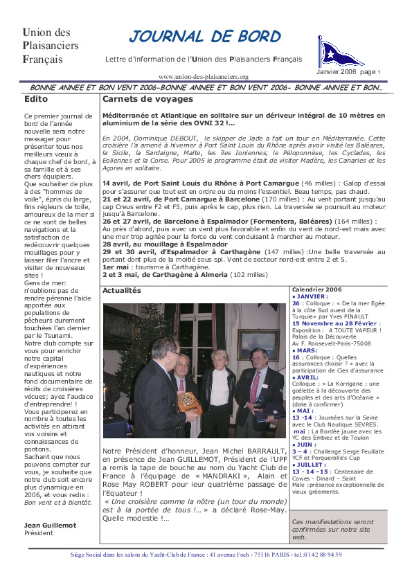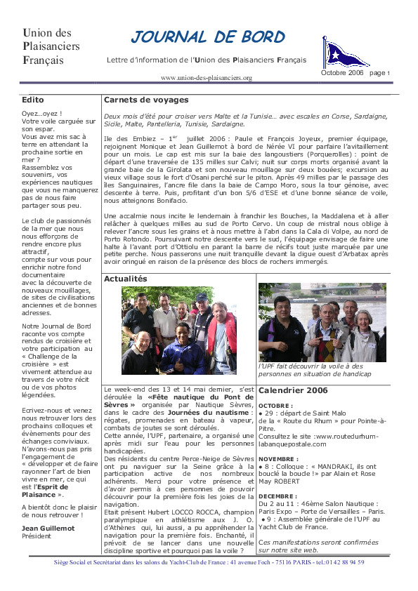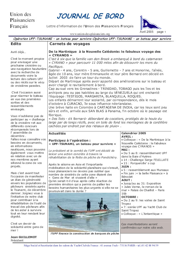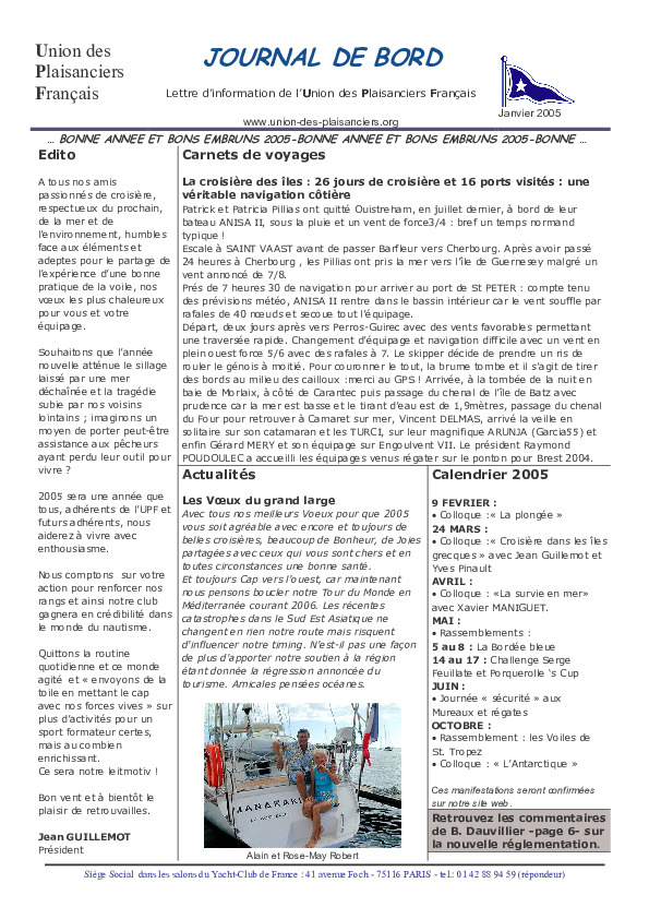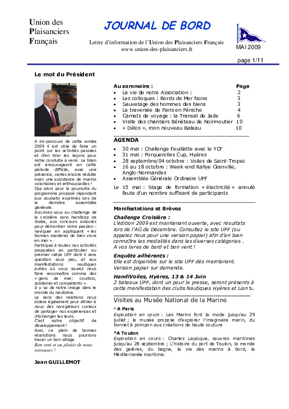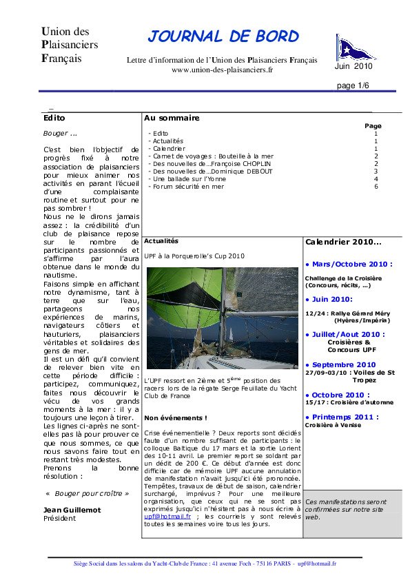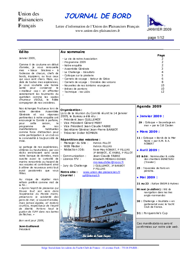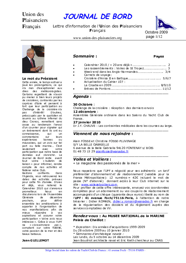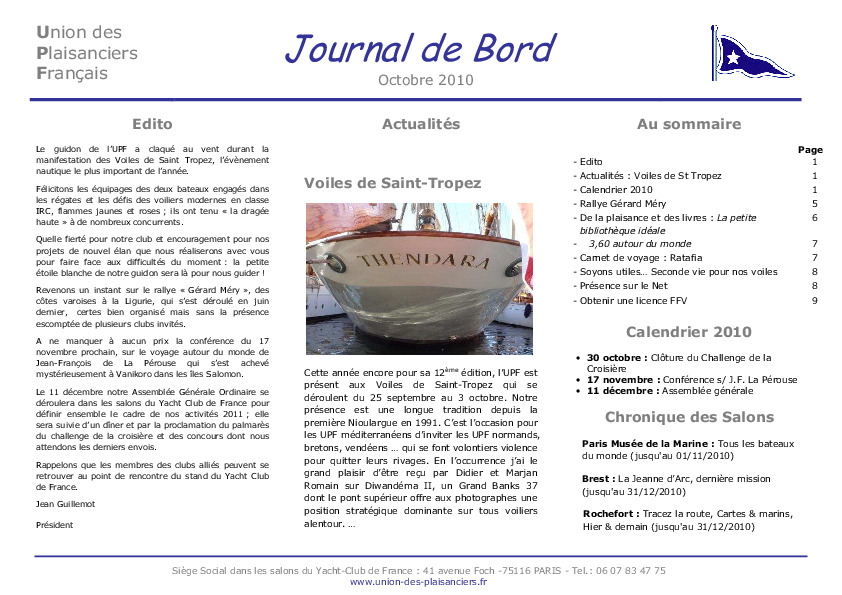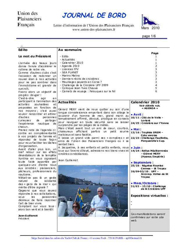 Agenda 2010 - Licences FFV - SEA PLANET - Marins Malins - Derniers récits de croisière - Mouillages payants en Corse - Challenge de la Croisière UPF 2009 - Adapter la vie à bord aux contraintes de la croisière par Jean Yves Chauve - Felouques sur le Nil par Jean-Pierre Barbot