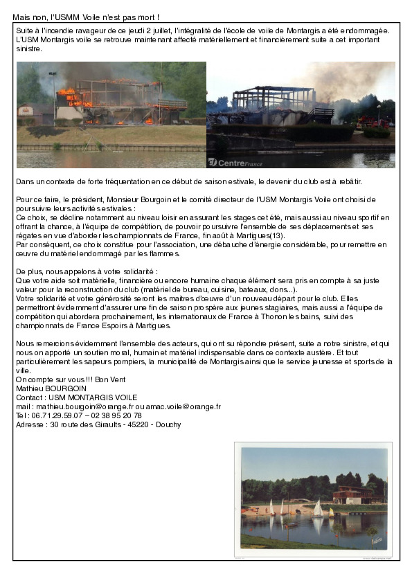 Suite à l’incendie ravageur de ce jeudi 2 juillet 2015, l’intégralité de l’école de voile de Montargis a été endommagée.