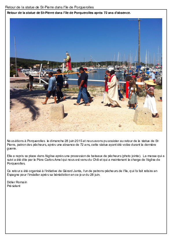 Nous étions à Porquerolles le dimanche 28 juin 2015 et nous avons pu assister au retour de la statue de StPierre, patron des pêcheurs, après une absence de 72 ans, cette statue ayant été volée durant la dernière