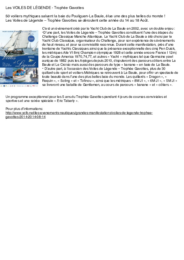Les Voiles de Légende – Trophée Gavottes se déroulent cette année du 14 au 18 Août 2014.